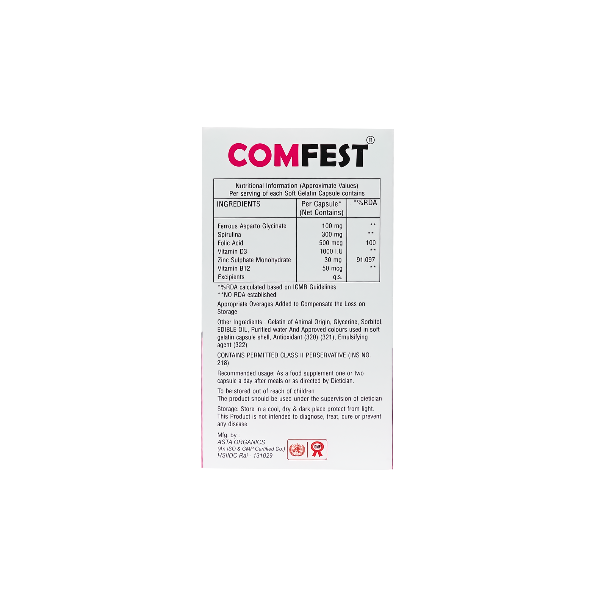 - Other ingredients: Gelatin of Animal Origin, Glycerine, Sorbitol, EDIBLE OIL, Purified water And Approved colours used in soft gelatin capsule shell, Antioxidant (320) (321), Emulsifying agent (322)